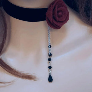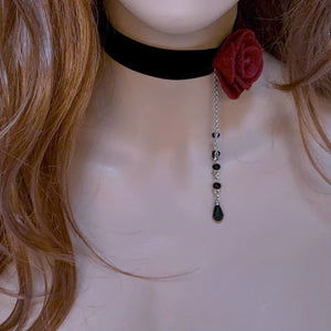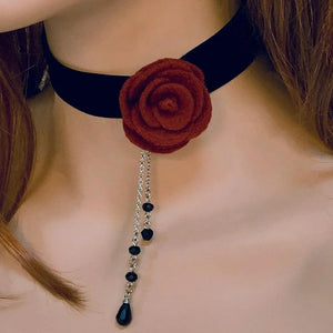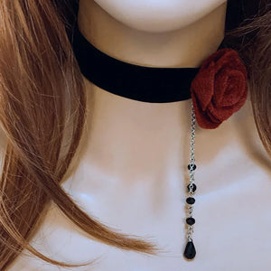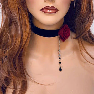 This black velvet red rose choker necklace is my take on romantic Victorian! A pretty, 1.5" red felt handmade flower has been sewn on to the side of the choker as the focal point. Dangling from behind the flower is an oxidized silver chain with black faceted crystal beads. So simple yet so dramatic! Measures approximately 12" with a 6" extension. Rose and black beads and chain may vary slightly - that's the beauty of handmade!