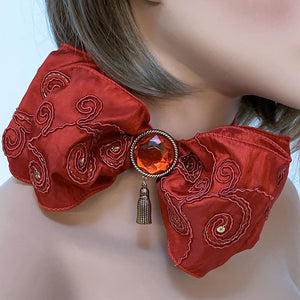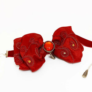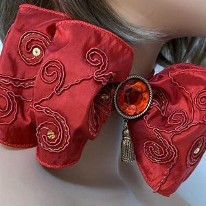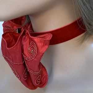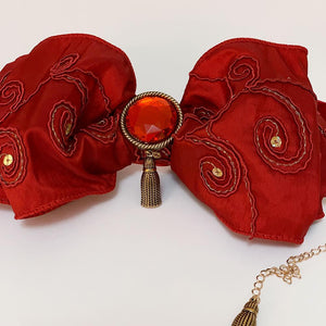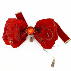 Wrap yourself up this festive season with this bright red Victorian bow choker! The bow itself is has been sewn off to the side of the velvet choker base for a sexy look. At the center of the bow is a large round Victorian style element with a golden tassel pendant which adds a bit of drama.
