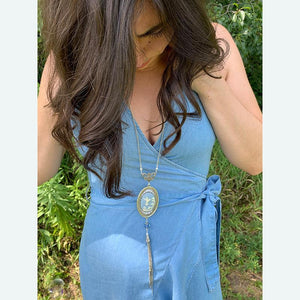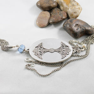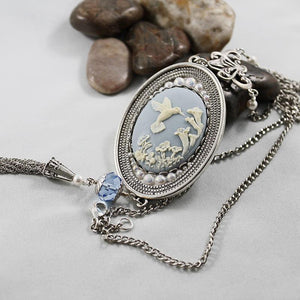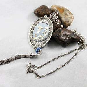 • Long and elegant, this Victorian-style blue cameo pendant necklace is one of a kind. The lovely hummingbird cameo sits within a hand embellished pearl setting and has a pretty finish on the backside. Here are the details at a glance: