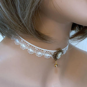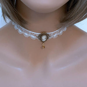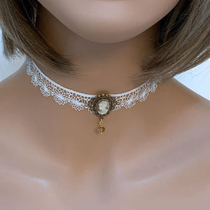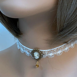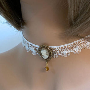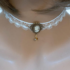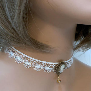 This handmade white lace Victorian cameo choker is so dainty and elegant. Front and center is a cream on beige cameo nestled in a scalloped oxidized brass setting. With the dainty, white scalloped lace, this lovely choker will add a bit of romance to any outfit.