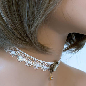 Fold your white lace Victorian cameo choker carefully and store out of direct sunlight.