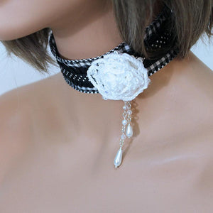 Three different ribbons have been fused together to create depth and texture in this lovely white rose black Victorian choker. I have crocheted a lovely white rose with sparkly, tiny clear crystal beads and sewn it slightly off to the side to create a bit of drama. Rose and beads may vary slightly - that's the beauty of handmade!