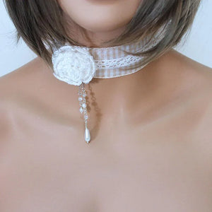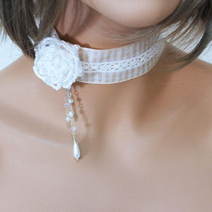 This white rose pearl Victorian choker has such a romantic feel to it. A narrow, white lace has been fused to cream and white striped ribbon for the base of this choker. Sitting slightly off to the side for a bit of drama is a crocheted white rose with sparkly, tiny clear crystal beads. Rose and beads may vary slightly - that's the beauty of handmade!