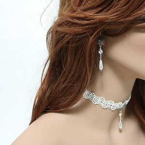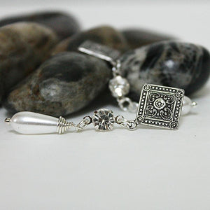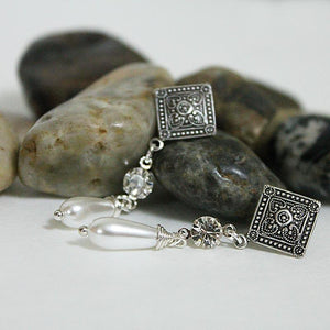 These lovely Victorian bridal pearl earrings have just the right amount of sparkle. A wire wrapped teardrop pearl linked to a simple rhinestone crystal conector dangle from a pretty, oxidized silver over brass setting. Surgical steel posts with a stainless steel butterfly clasp. A perfect match to our Victorian Pearl Lace Bridal Choker Necklace sold separately here.