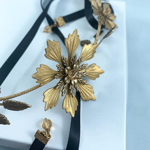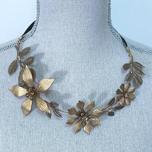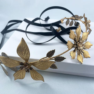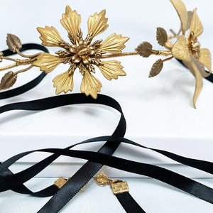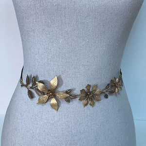 This lovely handmade gold flower headpiece can be ordered to wear in your choice of a headpiece, headband, belt or statement necklace! Measuring a length of 11", high-quality brass metal flowers and crystals have been hand wrapped around gold non-tarnishing wire. Each end has a formed, closed-loop. Choose with or without ribbon ends or lobster claw clasp closure with extension chain. Options on how to wear this piece:
