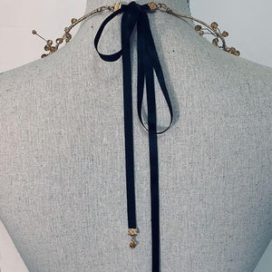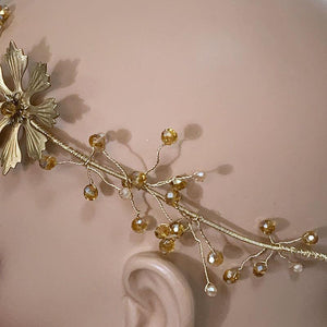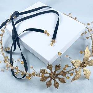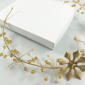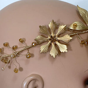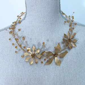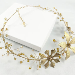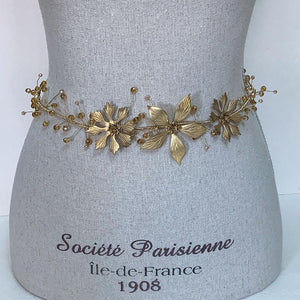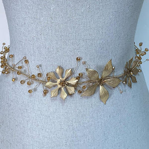 This beautiful handmade gold flower headpiece can be ordered to wear in your choice of a headpiece, headband, belt or statement necklace! Measuring a length of 21", high-quality brass metal flowers and crystals have been hand wrapped around gold non-tarnishing wire. Each end has a formed, closed-loop. Choose with or without ribbon ends or lobster claw clasp closure with extension chain. Options on how to wear this piece: