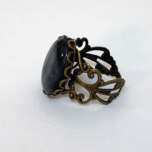 This Victorian-style floral ring has a black iridescent black cabochon in the center. It's been formed as a size 8 however it is adjustable up to size 9 and down to a size 6 by gently stretching or squeezing it to fit.