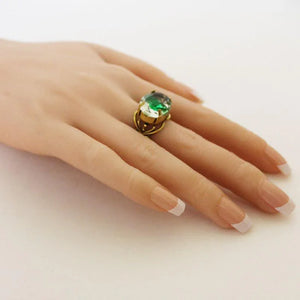 • With an 18 x 13mm clear crystal with green hues set in an oxidized golden filigree setting, this ring is easy to wear. Just gently squeeze or stretch to fit your finger perfectly. Great look for every day!