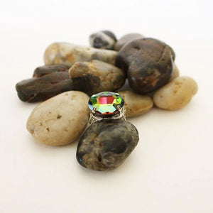 With purple and pink reflections this green faceted crystal measures 18 x 13mm and is set in a pretty silver-tone filigree band. Just gently squeeze or open to fit your finger perfectly!