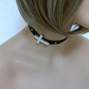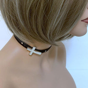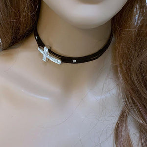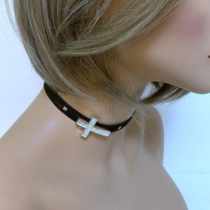 Add a bit of bling to your outfit with this faux black suede sparkly sideways cross choker. The oversized sparkly sideways cross is set off to the side for a sexy look. The choker measures 12" with a 6" silver tone extension chain complete with a small wire wrapped onyx bead so the back is pretty too! Cross measures 1" x 1.75".