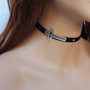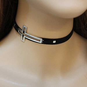 • With a large, open frame sideways cross set off center, this triple strand black suede large sideways cross choker is a bold statement. Here are the details at a glance: