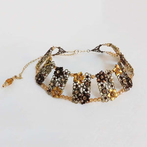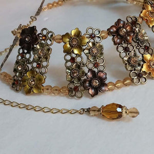 • Dramatic yet whimsical...and easy to wear! This golden statement necklace with floral components and crystal beads is the perfect finishing touch for your special occasion. With a lobster clasp and a 6" extension chain complete with a wire wrapped crystal, the back is pretty too!
