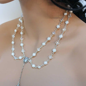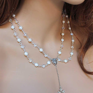 • This double strand necklace is truly stunning! White 8mm mother of pearl shell beads are linked with 8mm clear crystal beads to create this two-strand rosary type necklace collar. A pretty silver-tone 15mm sacred heart connector is at the center with a 2" thin silver-tone chain which ends with a small 22 x 18mm cross. With a lobster closure, this necklace measures 19" in length. A dainty 4" long chain with a small 17x12mm cross has been added to the back so that the back is pretty too! If you require a shorter length, please indicate this in the note to seller upon checkout.