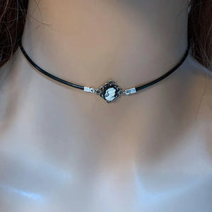 This dainty Victorian black cameo choker necklace combines classic with modern design! A traditionally classic cameo connector with a modern, narrow, black genuine leather cord makes this a choker you will reach for to complete your outfit. Easily wear this during the day and later for a night on the town. So versatile!