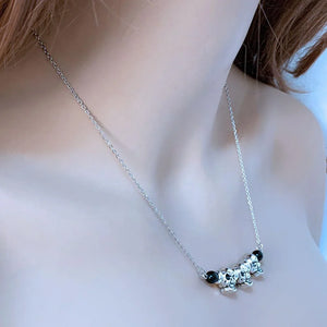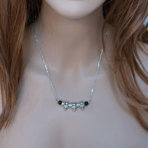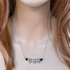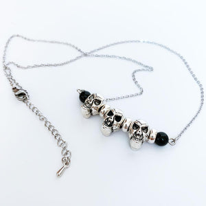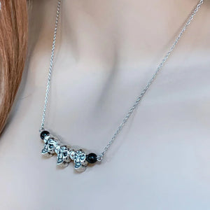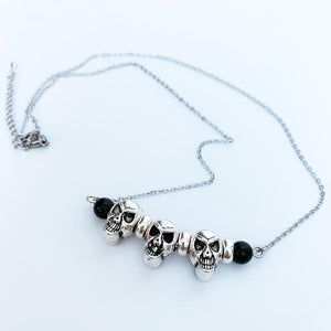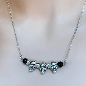 This one-of-a-kind Gothic silver skull necklace is a must-have accessory for your edgy style. Three silver-plated skull beads stare out with a defiant grin, daring observers to look away. Two black onyx beads add a touch of dark glamour. The dainty stainless steel chain is adjustable, so you can wear the necklace shorter for a dramatic statement or longer for a more casual goth-bohemian vibe. This necklace makes the ultimate personal style declaration. Once you put it on, you won't want to take it off. Here are the details at a glance.