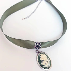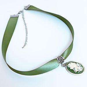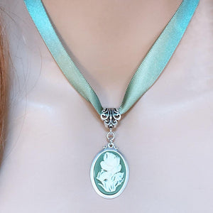 Green Ribbon Flower Cameo Necklace