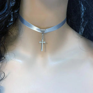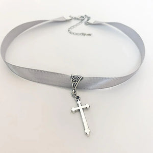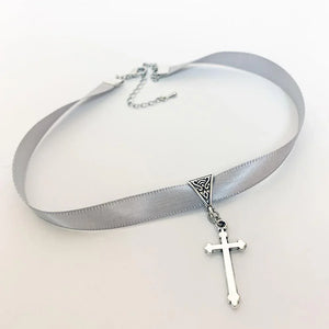 A narrow shiny silver/grey ribbon is the base for this cross pendant Gothic choker. The focal is a pretty, silver-plated connector with a silver-plated cross pendant. Here are the details at a glance: