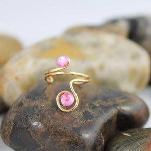• Made with non-tarnishing gold wire, this ring can be worn as either a toe ring or a pinky ring. Just gently squeeze it around your finger for a perfect fit. I have placed two pretty 3mm pink flat back crystals in the center of each spiral swirl to give it a bit of sparkle. The span of the swirls from top to bottom measures approximately 17mm. Great gift idea for teens!