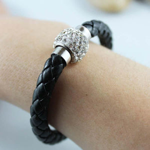 This bangle bracelet is great for any occasion. 6mm round black braided leather cord is connected by a beautiful rhinestone bead-like magnetic clasp. Easy to put on, this will easily become your go-to bracelet! The bracelet pictured fits a 7.5" wrist.