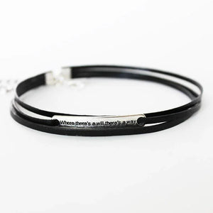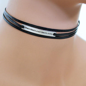 This trending choker is made with three strands of genuine flat black leather. With the "Where there's a will there's a way" stamped silver-tone connector set off to the side this choker is both inspirational and sexy!