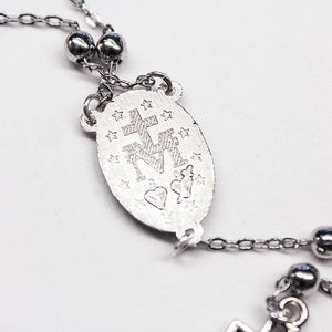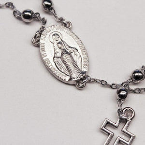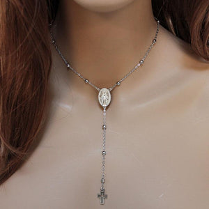 • With a lovely silver tone Madonna medallion measuring 20 x 12 mm at the center of a silver-tone satellite chain, this rosary style choker measures approximately 15". Choose from a simple lobster closure or with an added 3" extension chain complete with a small cross charm to make the length adjustable.