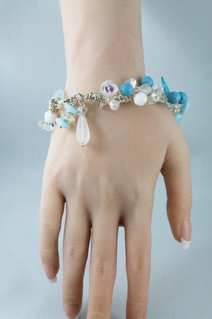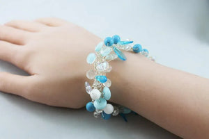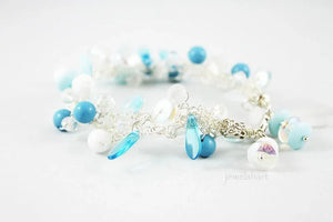 Blue, white, clear and frosted Preciosa beads in various shapes and sizes are crocheted together to form this lovely wire bracelet. With a lobster closure this bracelet measures approximately 8" in length. Fits a 7" wrist.