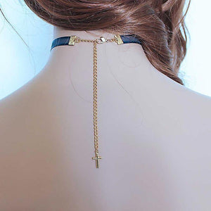 A thin 10mm wide navy blue ribbon is the base for this dainty choker. The focal is a gold-tone connector with your choice of large or small gold-tone cross pendant. This choker necklace measures approximately 12" in length with a 5.5" gold tone extension complete with another cross on the end so the back of this choker is pretty too!