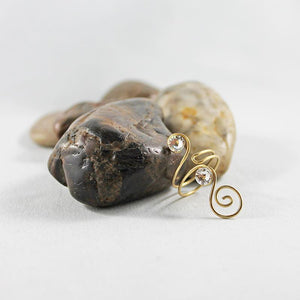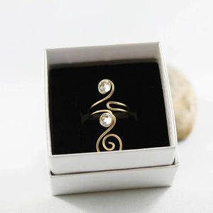 Double swirl spirals are the focal point of this pretty toe ring. Made from non- tarnishing gold wire, this ring is wrapped so that it is adjustable. Two 5mm clear crystals have been added for just the right amount of sparkle. Size 3.5