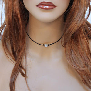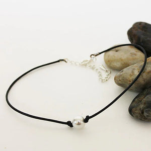 A single mother of pearl shell bead is front and center in this simple but dramatic choker necklace. Narrow genuine black leather cord with lobster closure and extension chain. Measures 14" in length adjustable to 16". If you prefer a longer length, please indicate in the notes upon checkout.