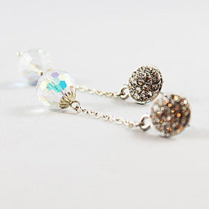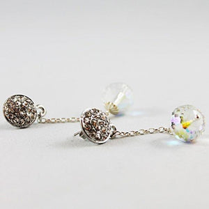 These long crystal dangle earrings measure approximately 2" from the bottom of the 12mm rhinestone stud. At the end of each of the sterling silver chains is a beautiful sterling silver capped Swarovski AB crystal. So simple and elegant for any bride on her wedding day or for any special occasion!