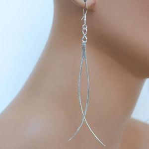 Handcrafted from sterling silver wire, these abstract earrings are the perfect accessory for a night on the town. Super long, two semi-curved silver wires have been hammered flat and fastened together to form this unique dangle that moves when you do. The earrings measure approximately 4" from the sterling silver hook.