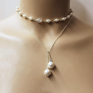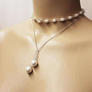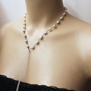 Pearl Lariat Necklace, Sterling Silver Crystal Open Necklace