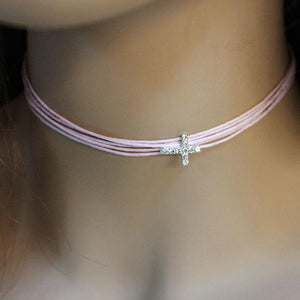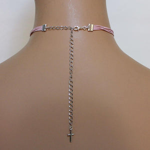 Oh so pretty in pink! This summer choker is made with several strands of pink cord and a sparkly tiny cross to add just the right amount of bling. Measures 12" with a 6" extension chain complete with a tiny cross so the back is pretty too.
