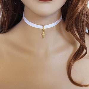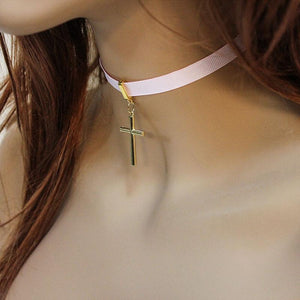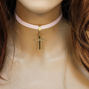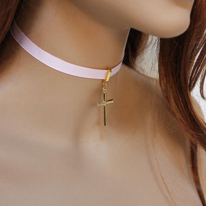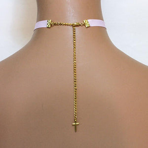 A thin 10mm wide pink ribbon is the base for this spiritual choker. The focal is a gold-tone connector with a gold-tone cross pendant. With your choice of a small or large cross, this choker necklace measures approximately 12" in length with a 6" gold tone extension complete with another cross on the end so the back of this choker is pretty too!