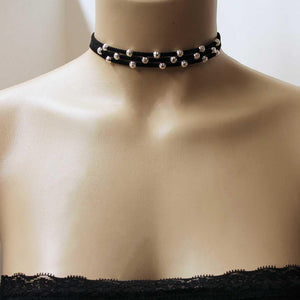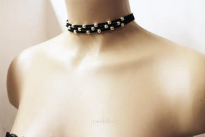 This simple black choker is a great everyday fashion statement! Several 6mm silver plated beads have been strung on the three strands of suede cord. The beads can be arranged together or spaced apart. Just slide them along the cord to achieve the look you want. With a lobster clasp, the choker measures approximately 12.5" with a 6.5 extension. Extension chain may vary.