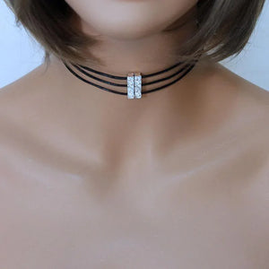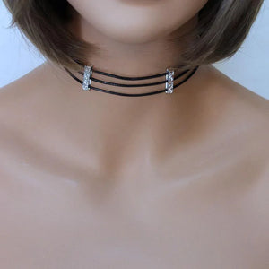 • This triple strand leather choker is so versatile! Found silver tone connectors can be moved to create different looks. Slide them to the center, side or space them - looks great any way. Details at a glance: