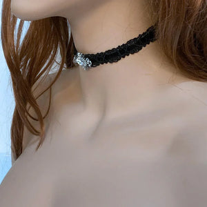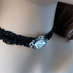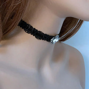 Elegant and lovely, this black velvet sparkly Victorian choker will dress up your outfit for an evening out or for a romantic evening in. Front and center is an oxidized silver connector, hand sewn to the ribbon, which holds an oval clear crystal. With the extension chain and lobster closure, you can adjust it to fit your neck with plenty of chain to adorn your back too!