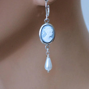 At the bottom of these blue cameo silver earrings, there's a pretty teardrop pearl. Here are the details at a glance: