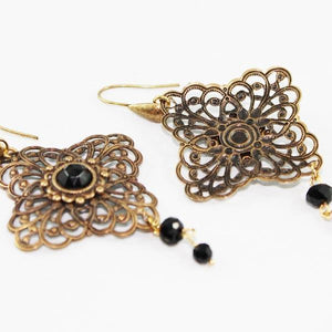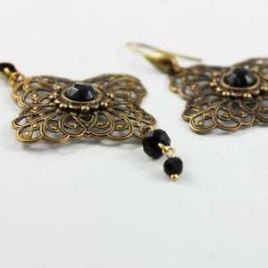 The beautifully detailed 40 x 40mm oxidized brass filigree I've used for these earrings is slightly puffed. A pretty, small, black faceted crystal within its own detailed setting nestles perfectly in the center of the main filigree setting. Two pretty black faceted beads dangle from the filigree to complete this Victorian-style piece. The total length from the bottom of the oxidized brass ear hooks is approximately 53mm. High quality oxidized brass components. Lead & nickel free.