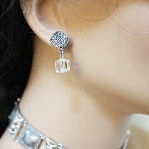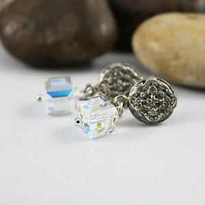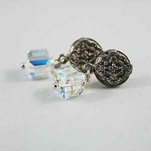 A beautiful 8mm crystal AB cube has been wire wrapped and linked to a lovely 11mm oxidized silver over brass medallion like stamping with a surgical steel post. These gorgeous earrings measure approximately 28mm (or 1.25") from the top of the medallion to the bottom of the crystal.