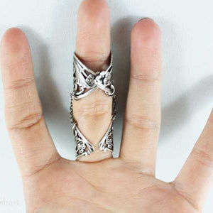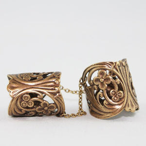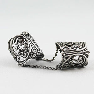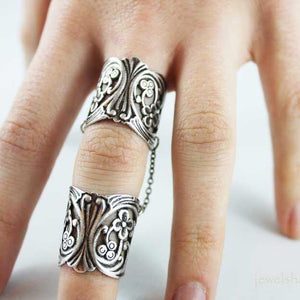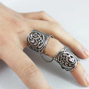 Resembling finger armor, these two floral rings are adjustable to fit most finger sizes. One ring is for below the knuckle, one for above the knuckle with a chain dangling from both sides of each ring linking the two rings together to form this bold style ring. Just gently squeeze the rings to fit your finger perfectly!