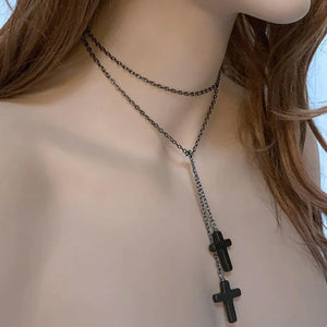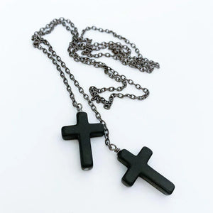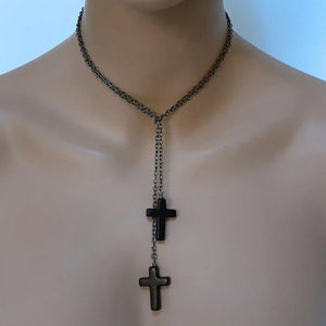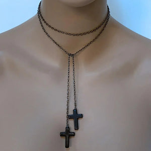 This Gothic style, double-cross lariat necklace is so versatile. With two large, black crosses on both ends of this open necklace there's no clasp to fuss with. Wear it long or wrap it once, loop and go! You can even loop it as you would a scarf (second photo). Here are the details at a glance:
