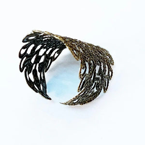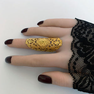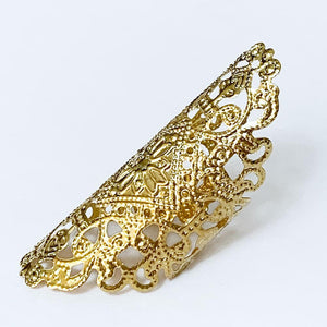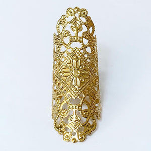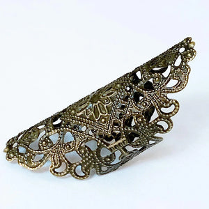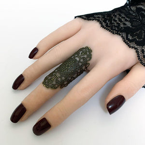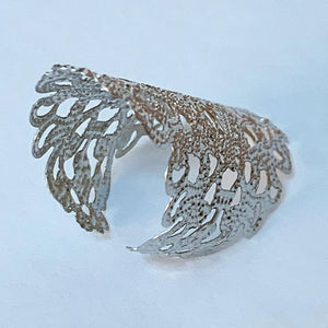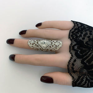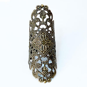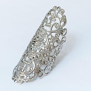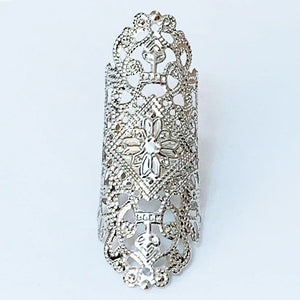 This Gothic filigree finger wrap ring is adjustable to fit most finger sizes. Spans 2" long - a great look! Just gently squeeze the ring around your finger for a perfect fit.