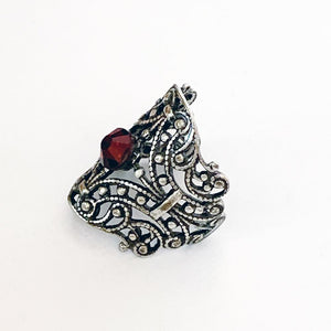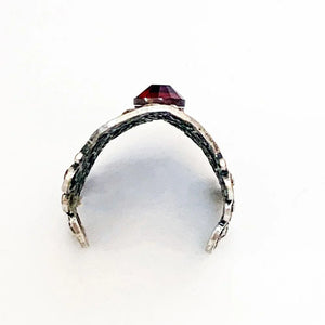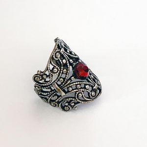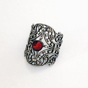 An ornate oxidized silver over brass filigree connector is the base of this lovely Gothic style midi/knuckle ring. A 4mm red faceted crystal is a perfect focal point.