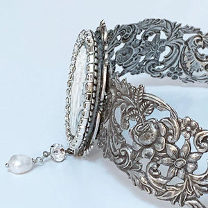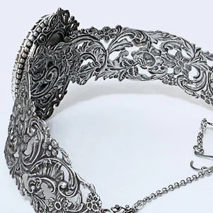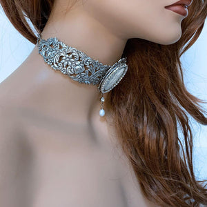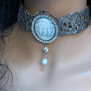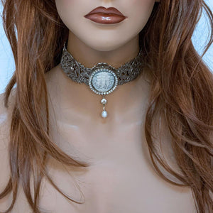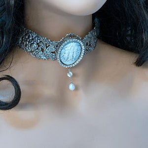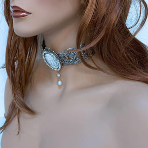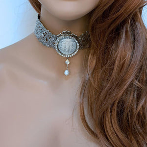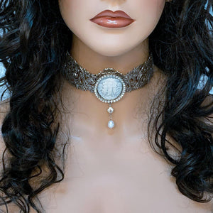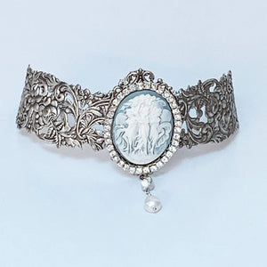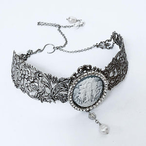 Make a dramatic entrance with this spectacular Gothic Victorian bridal choker! With the lovely extra large three muses cameo front and center, you're sure to capture everyone's attention. Here are the details at a glance: