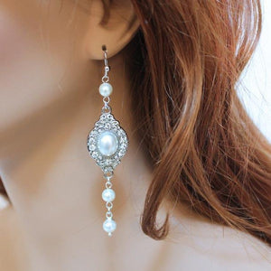 These long pearl earrings are great for any special occasion! Dangling from sterling silver hooks are white mother of pearl shell pearls connected to a lovely pearl and rhinestone pendant. Measure approximately 3" from the bottom of the hook.