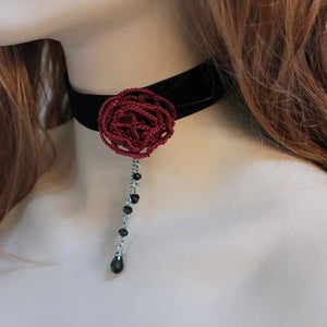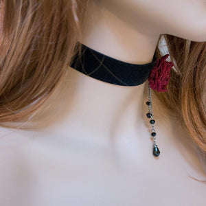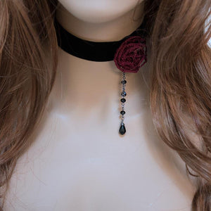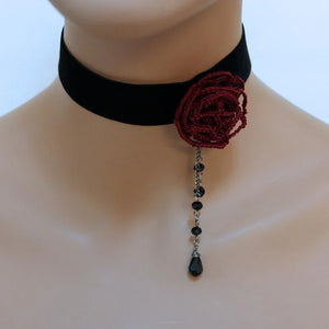 I have crocheted a pretty red flower and sewn it on to the side of the black velvet as the focal point in this pretty Victorian style choker. Dangling from behind the flower is a gunmetal chain with black faceted crystal beads. So simple yet so dramatic! Measures approximately 12" with a 6" extension. Rose and black beads may vary slightly - that's the beauty of handmade!