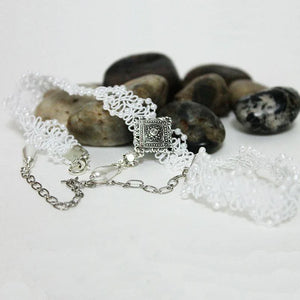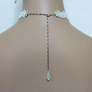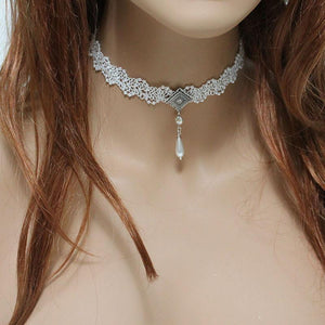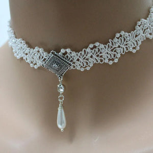 Tiny white pearls in a zigzag pattern enhance the beauty of this lovely Victorian style lace bridal choker. Front and center is a wire wrapped, teardrop pearl dangling from a pretty oxidized silver setting. For a little sparkle, I've added a small rhinestone crystal connector between the setting and pearl. Dainty and elegant, this necklace is perfect for any bride on her special day!